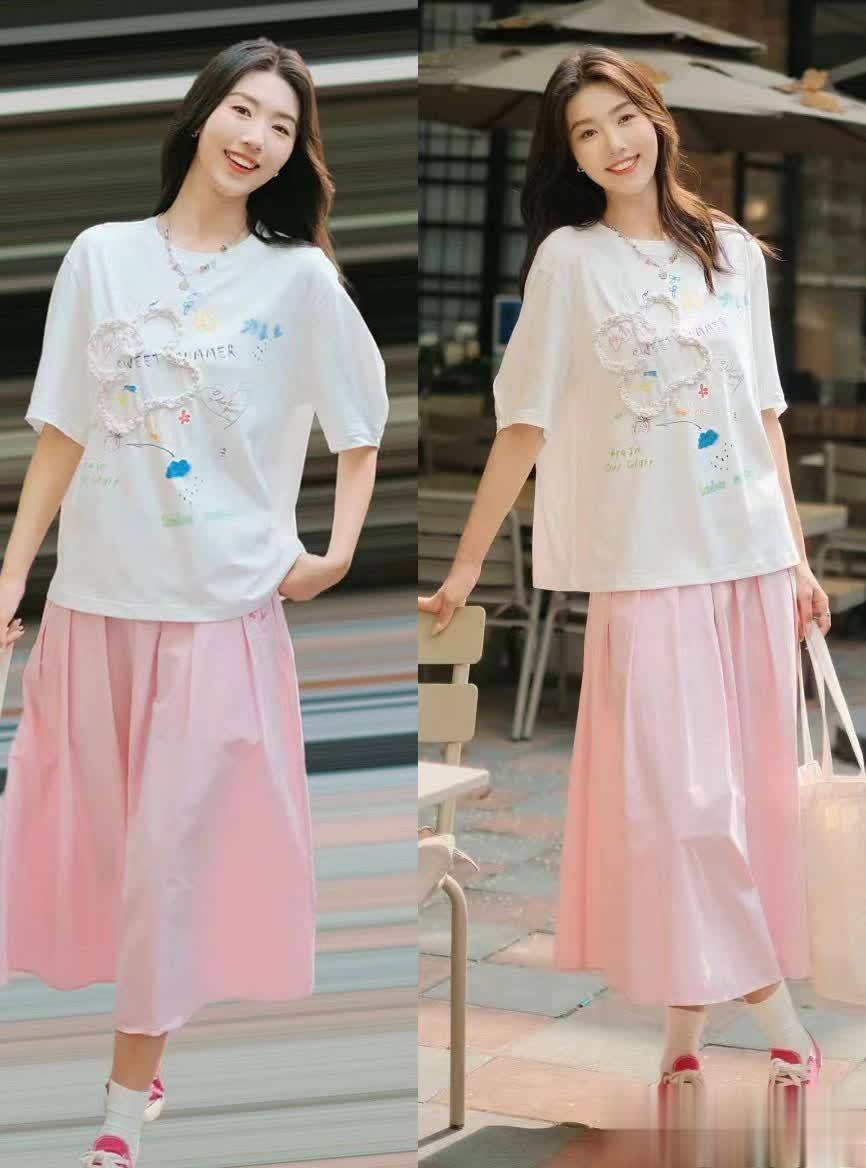 浅粉色的小裙子,看上去就偏文艺甜美感,后面叠加白色T恤的话,塑造出的视觉风格就比较日常,不会带来什么驾驭难度。