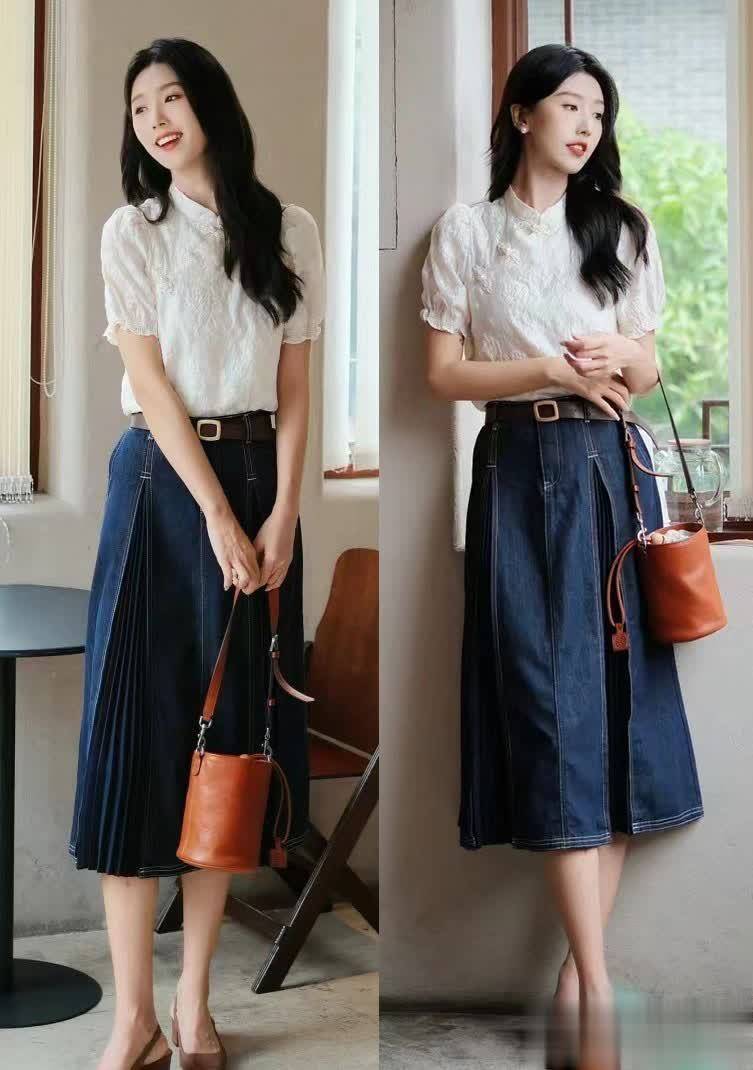 就像是上文说过的牛仔面料,其实除了设计成为牛仔裤以外,牛仔裙也有着格外出彩的时尚氛围。这位博主就采用了新中式上衣+牛仔裙的搭配,两种不同风格的碰撞,也使穿搭迎来了更丰富的视觉观感。