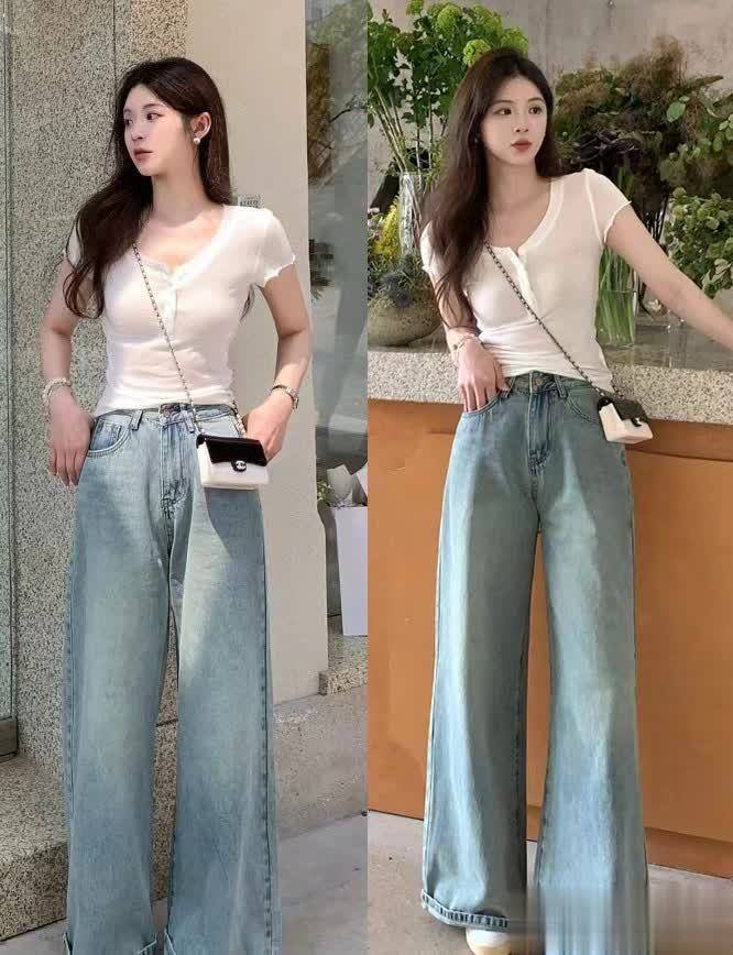 就像是其经典的蓝白配,应用了白色修身短T和牛仔阔腿裤,十分完美的诠释出了清爽高级的一面,不挑身材或是年龄。