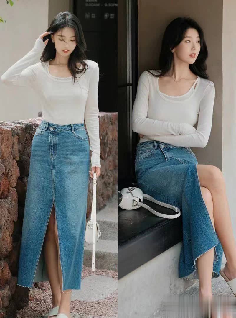 本身裙子设计就比长裙要更具有清凉感,但也有一些女士,觉得牛仔裙看上去还是会略微闷热,那么就不妨再加入开叉设计,保持更多的露肤面积。