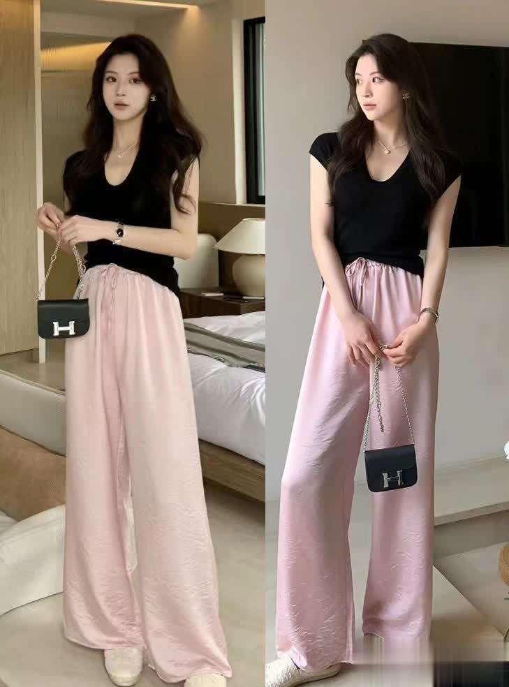 觉得牛仔面料厚重感略高的话,也可以试试各种材质轻薄的种类,例如浅粉色的阔腿裤,单从外观看来,携带的凉爽感和舒适感就比较出众。